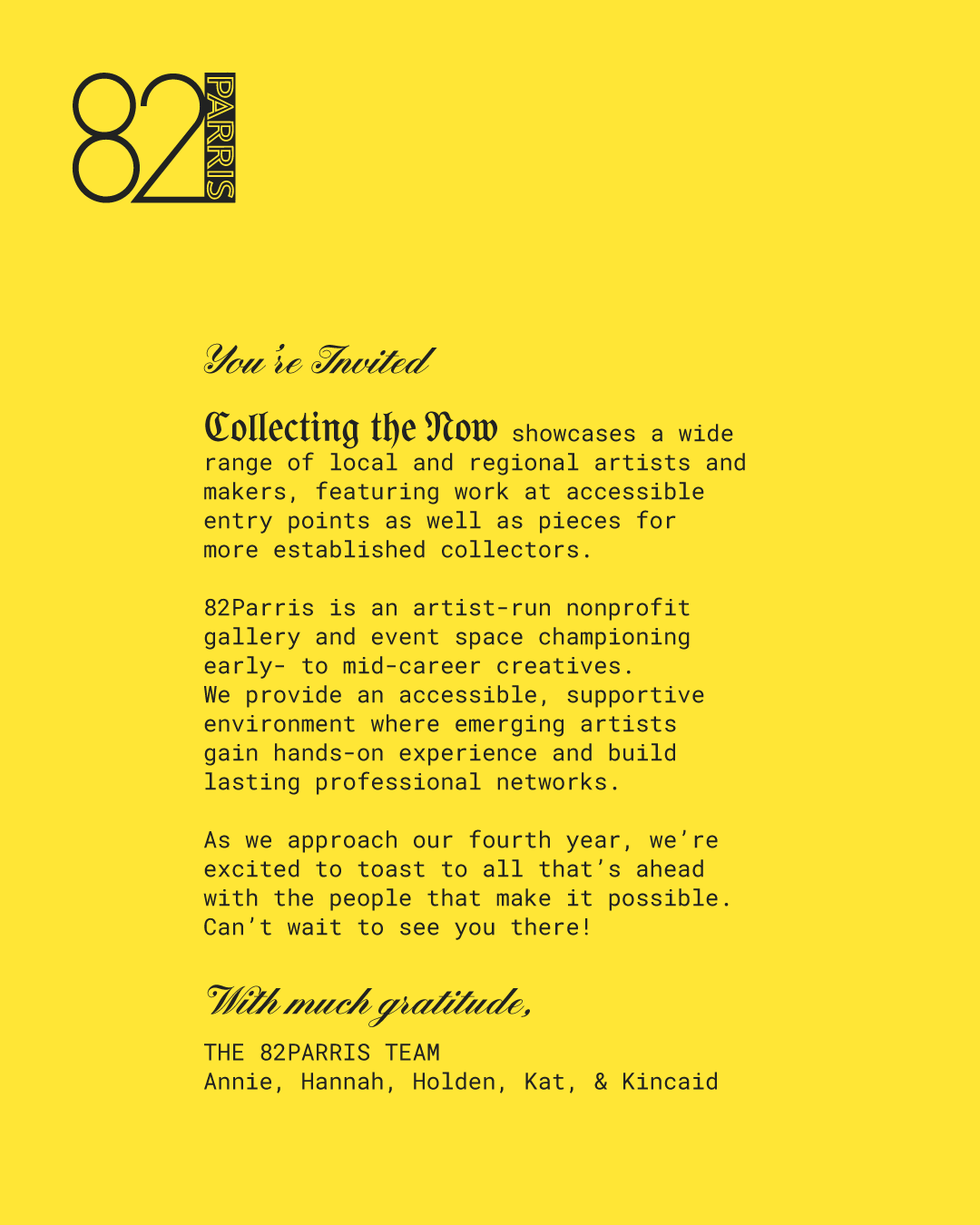 82Parris is an artist-run gallery dedicated to supporting early- to mid-career creatives through exhibitions, public openings, and artist talks. By cultivating an accessible, collaborative environment, we provide practical experience and meaningful opportunities for artists to build lasting professional networks and connect with the broader local community. Located in Portland, Maine’s Bayside neighborhood, 82Parris fosters creative growth, exchange, and public engagement.